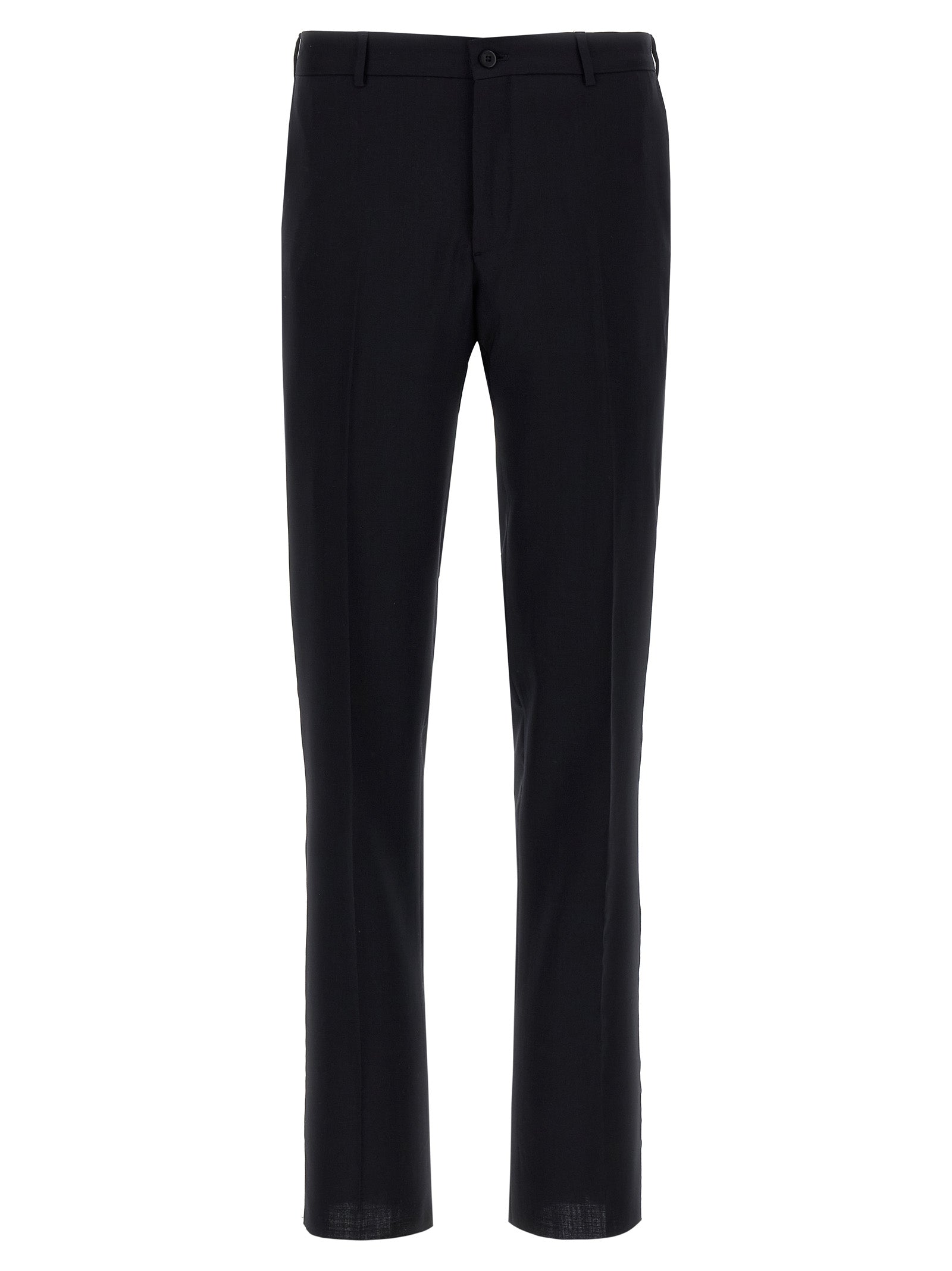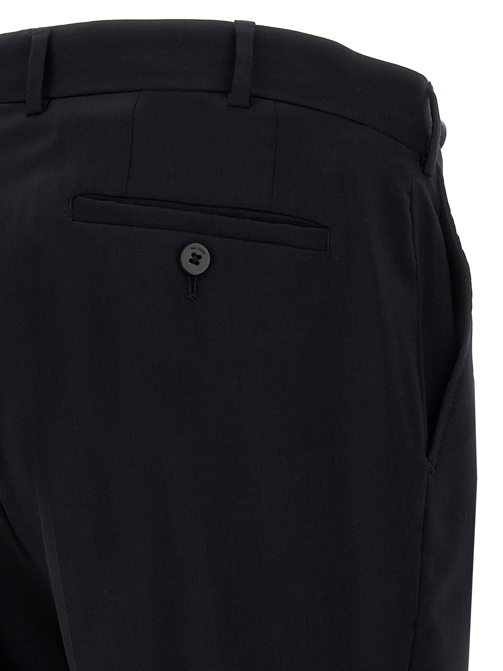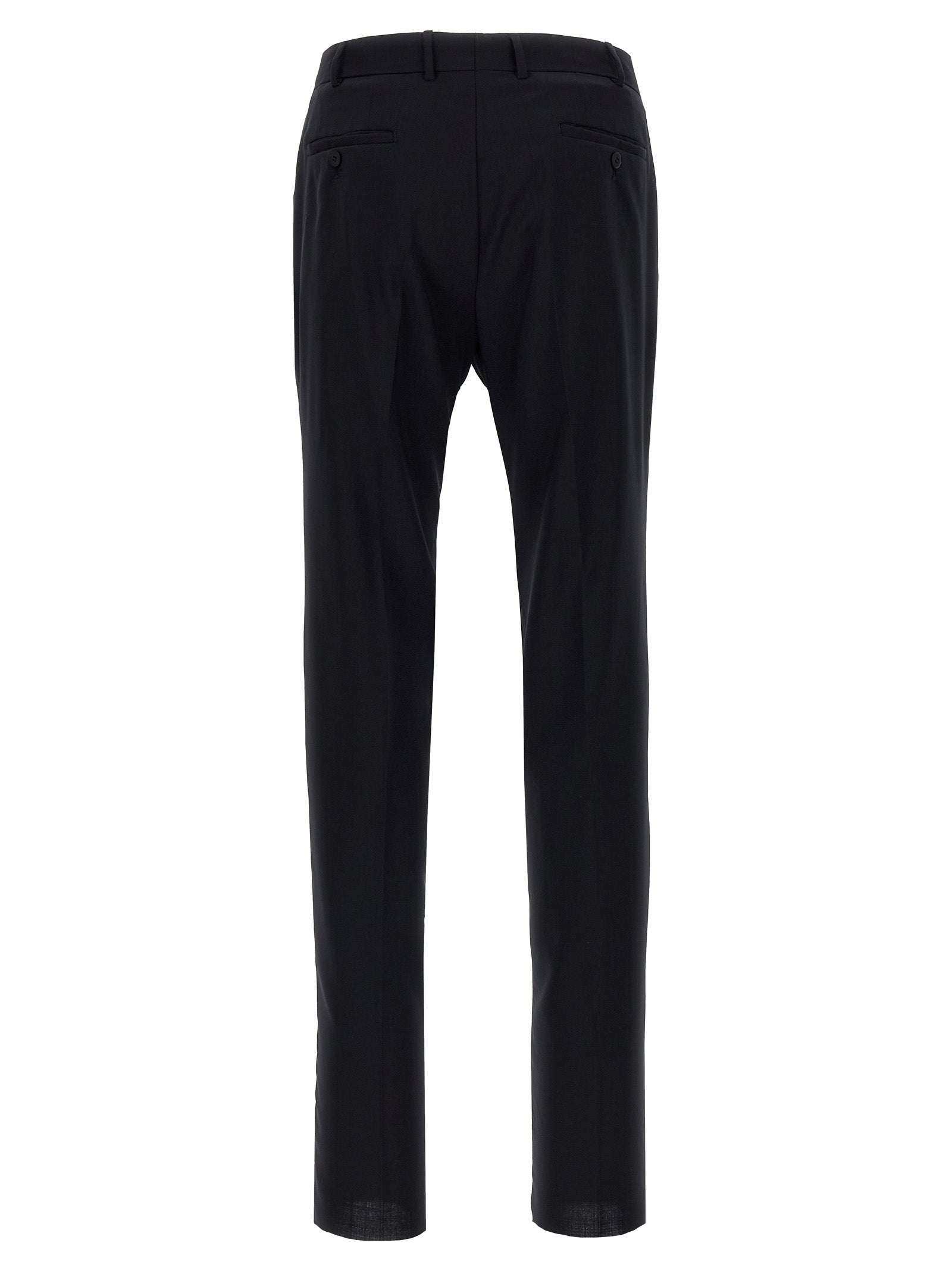 Duca' wool dress consisting of single-breasted blazer with button closure, mirror lapels, breast pocket, flap pockets, cupro lining, two inner pockets, structured shoulder strap, buttonhole cuffs, back slits, removable metal logo brooch and ironed pleat pants, front pockets americane", back welt pockets, front zip and button closure, viscose lining.