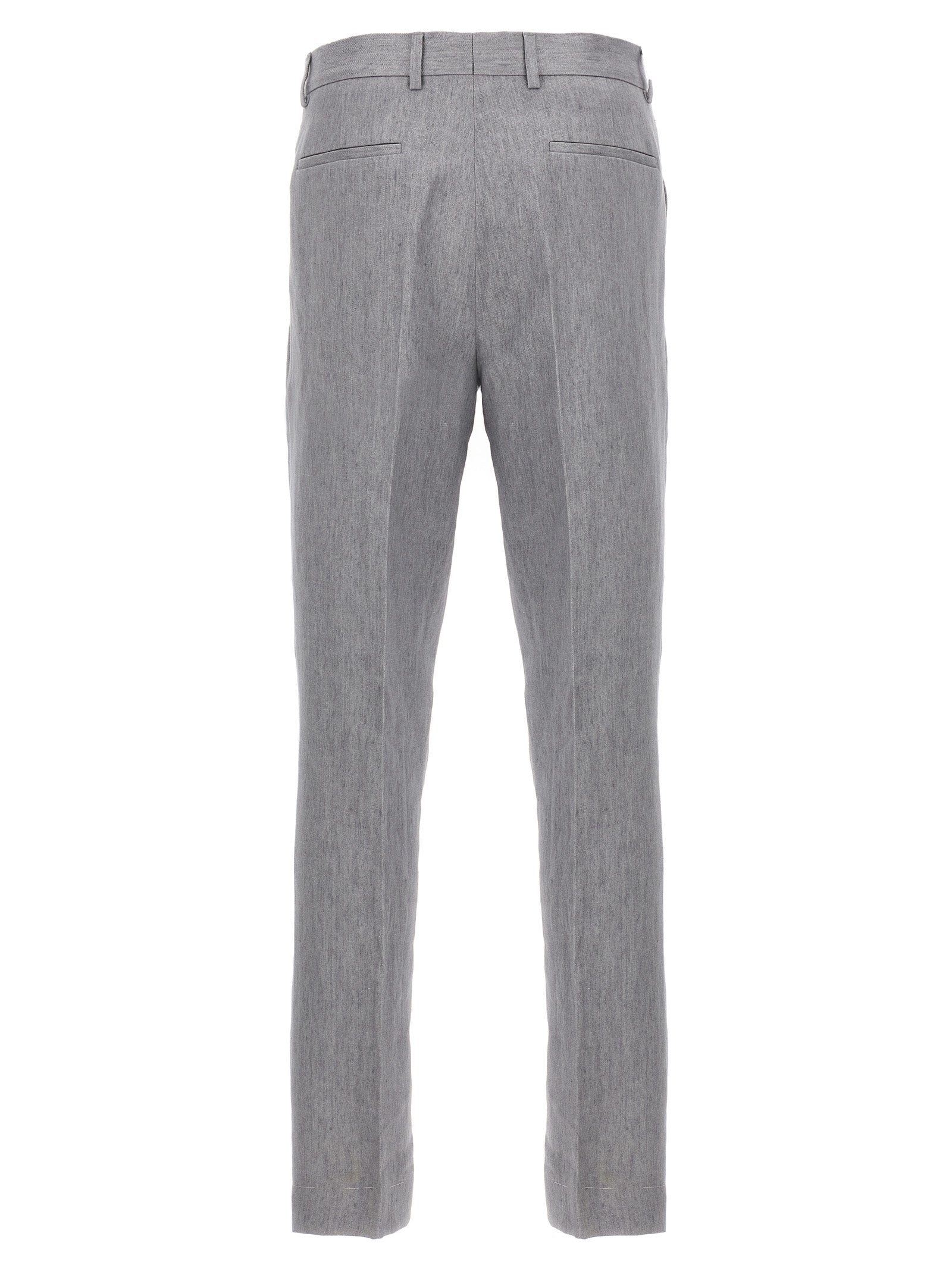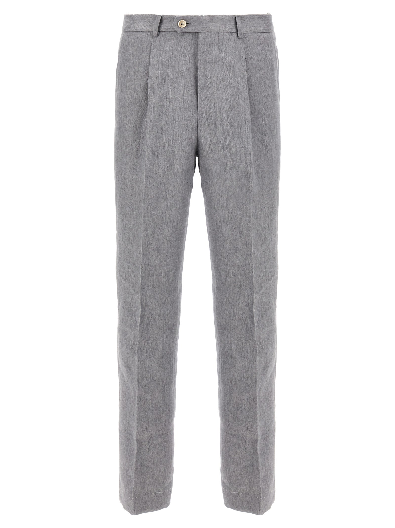 Linen denim dress consisting of a deconstructed blazer one and a half breasts with 6 metal button closure, peak lapels, patch pockets, ticket pocket and chest pocket, two inner pockets with button closure and pen pocket, 'Spalla Solomeo', cuffs with opening buttonholes, half cupro lining, back slits and pants with pleats, Front "americane" pockets, back welt pockets, hook and front button zip closure, turn-up at the hem.