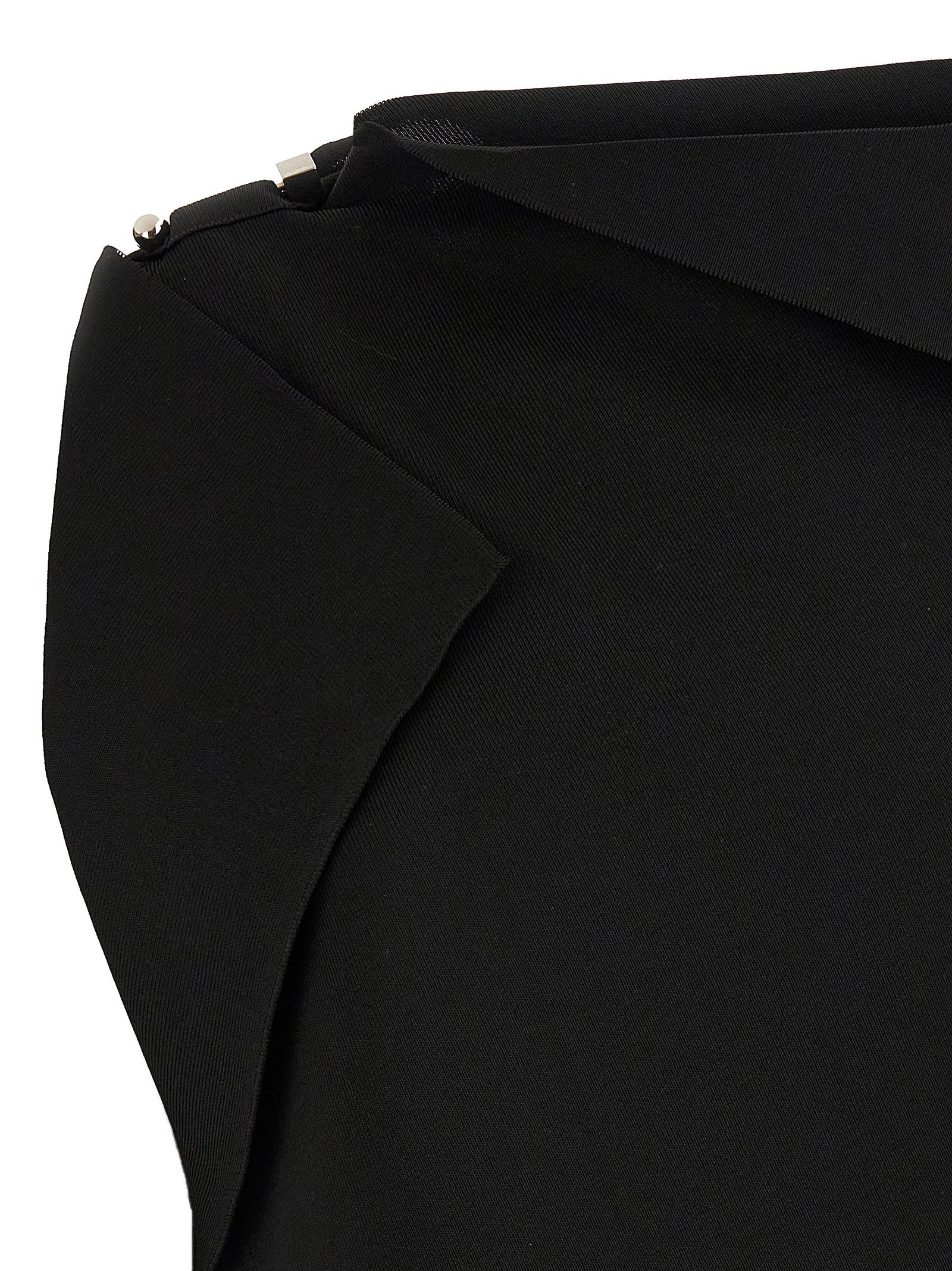 'La Mini Robe Trapèze' dress in 3D effect viscose knit, asymmetrical and draped shape, boat neck, sleeveless, metal Rond-Carré brooch on the shoulder.
