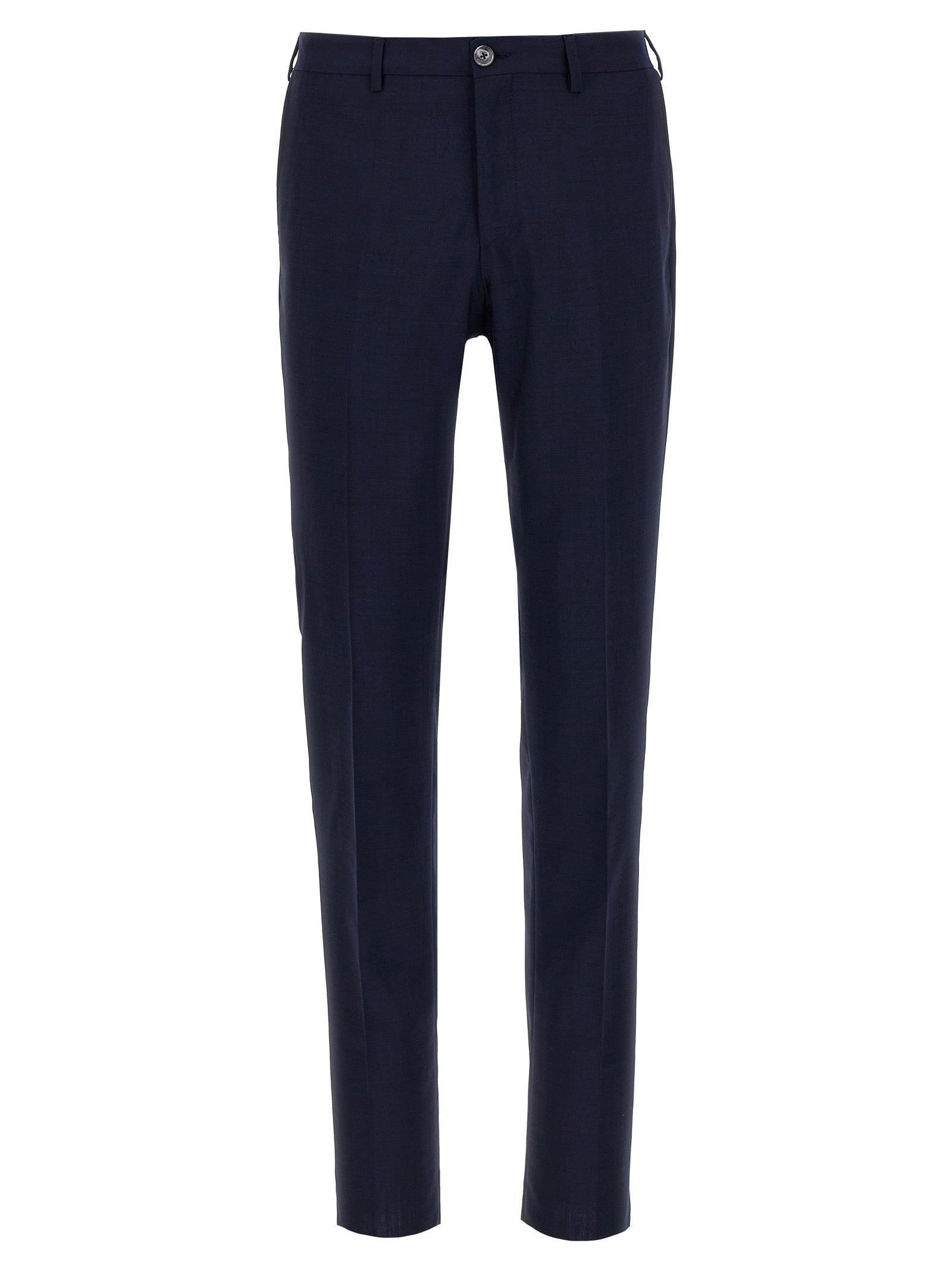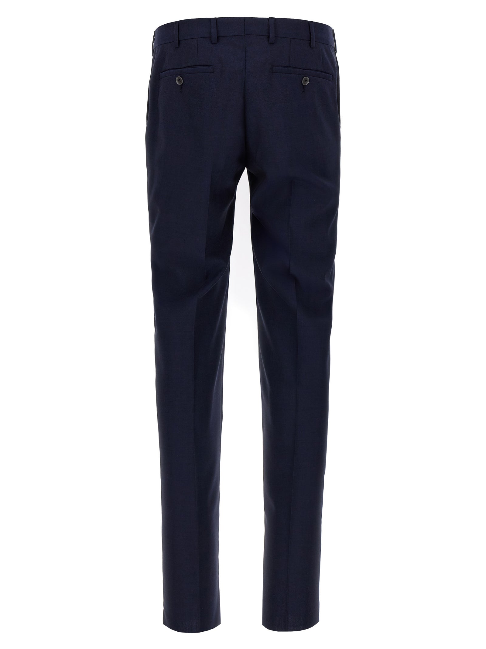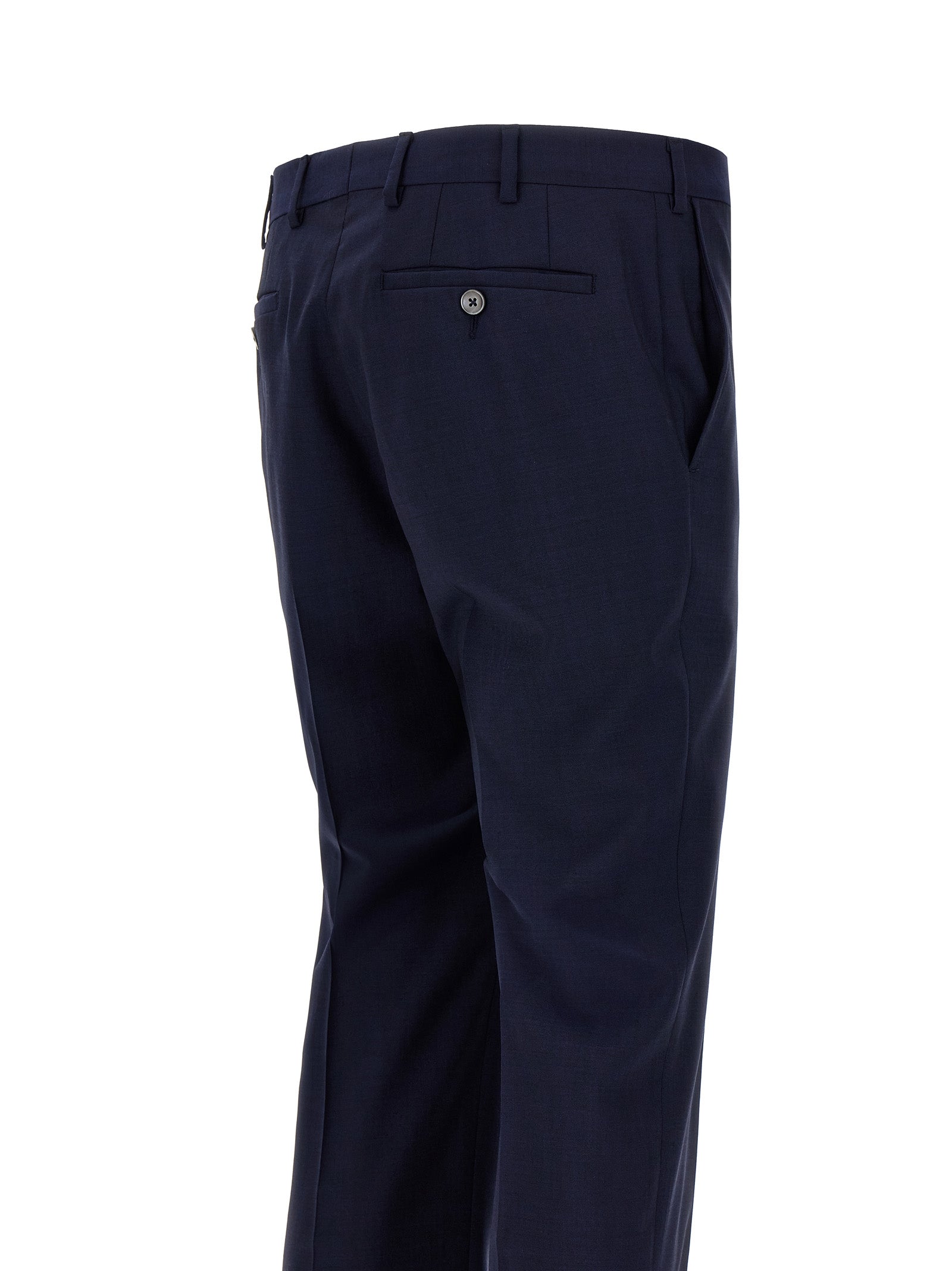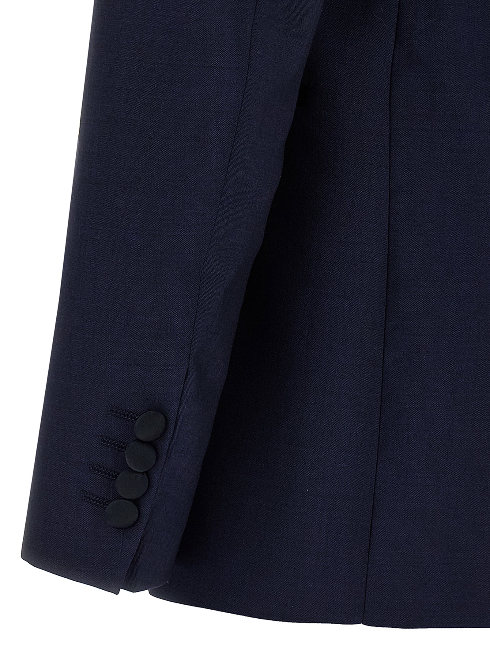 'Vicenza - linea Cerimonia' wool dress consisting of single-breasted blazer with single button closure, tonal satin details, peak lapels, chest pocket, patch pockets, viscose lining, two inner pockets, structured shoulder strap, cuffs with opening buttonholes, back vent and trousers with stretched pleat, front pockets americane", back welt pockets, front zip and button closure, viscose lining.