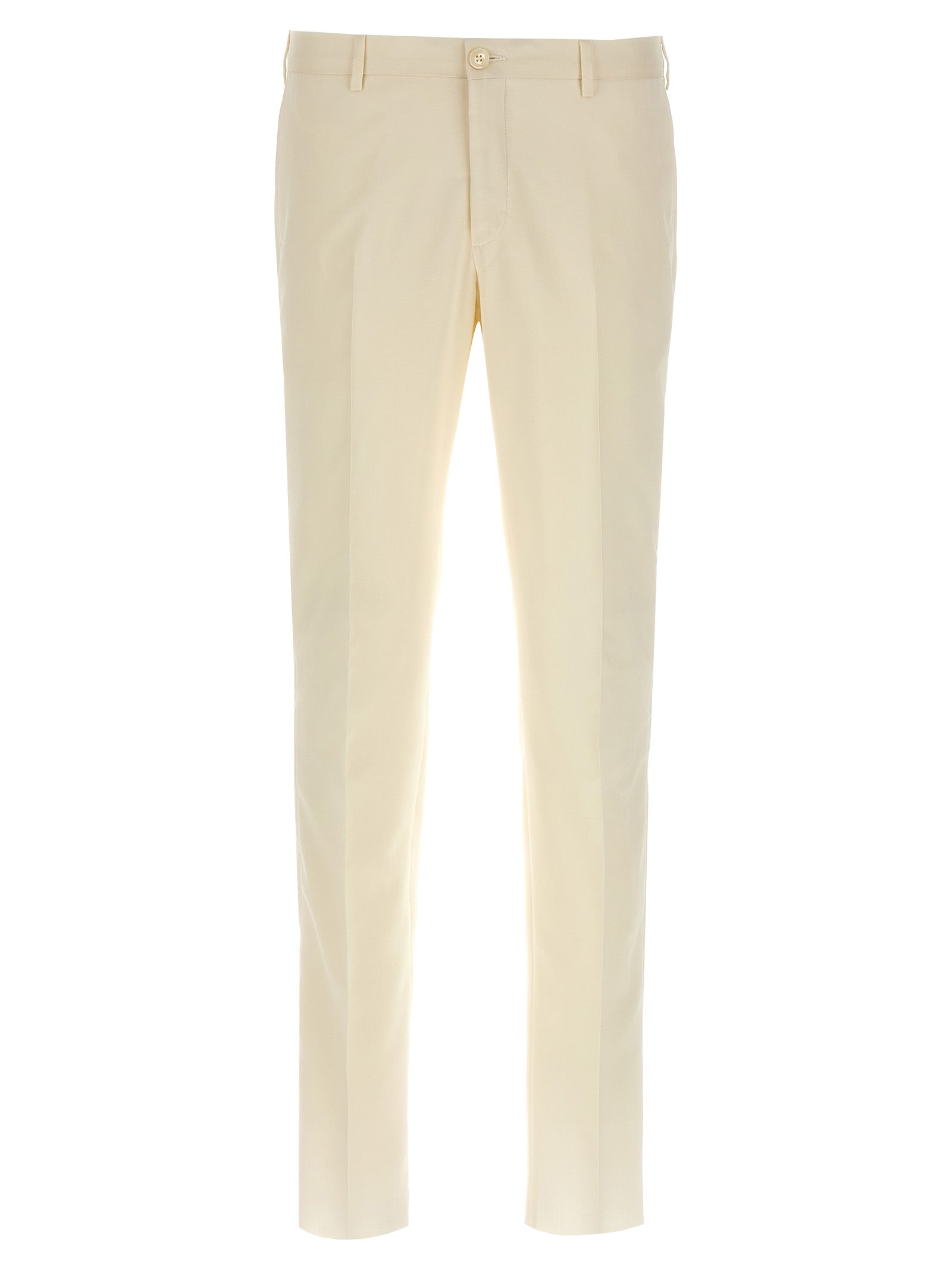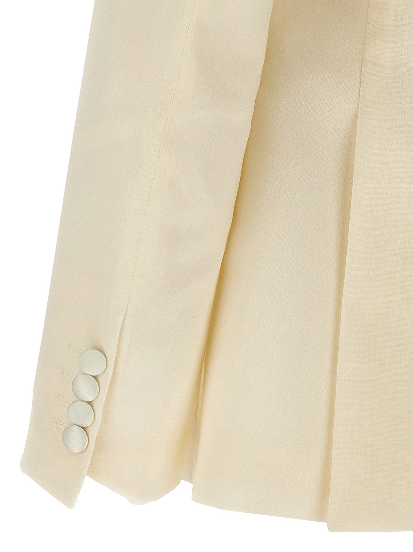 'Vicenza - linea Cerimonia' wool dress consisting of single-breasted blazer with single button closure, tonal satin details, peak lapels, chest pocket, patch pockets, viscose lining, two inner pockets, structured shoulder strap, cuffs with opening buttonholes, back vent and trousers with stretched pleat, front pockets americane", back welt pockets, front zip and button closure, viscose lining.