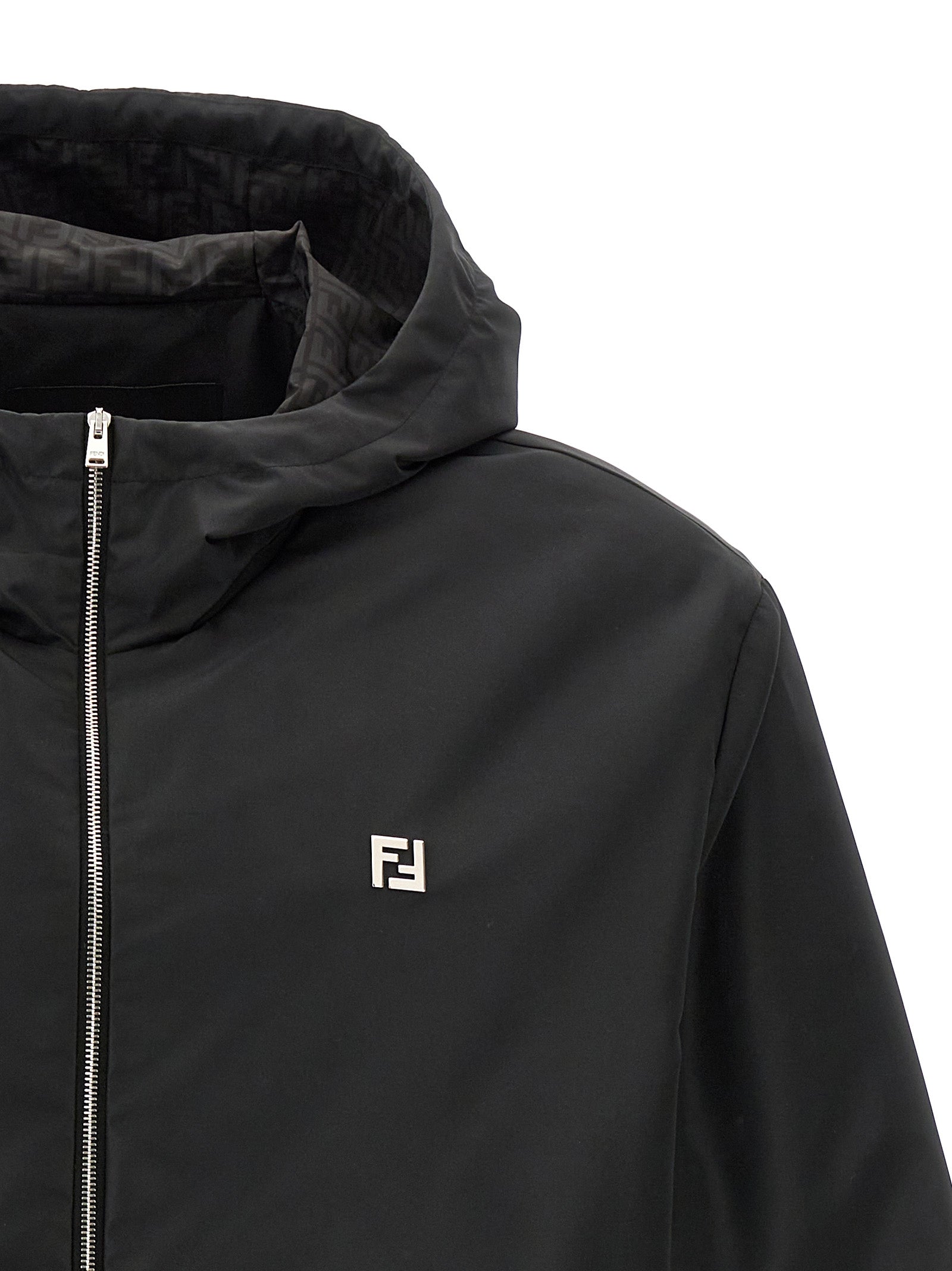 Tech fabric blouson, all-over monogram logo print lining, metal logo appliqué on the front, hood with adjustable drawstring, front zip closure, pockets, long sleeves with elastic cuffs, drawstring at the hem.