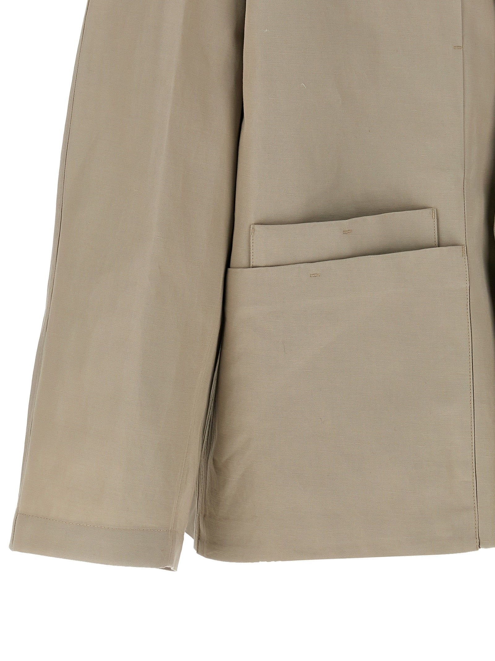 'Boxy SB Workwear' jacket in cotton and linen gabardine, unlined, front button closure, collar, pockets, long sleeves with dropped shoulders.